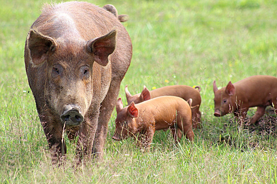 We strive to provide our animals with as much fresh air and abundant space to roam as possible, preferring to shelter rather than confine them. Our Heritage Tamworth sows, for example, can be seen out in the fields year-round with their young. Even on the coldest, snowiest days, the pigs seem happiest outside as long as they have a dry and warm shelter to retreat to when they’re ready to come in.
