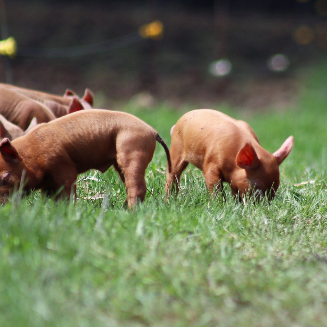 Tamworth pigs are one of the oldest breeds of pigs and a natural choice for a pasture-raised system due to their hardiness, good mothering ability, plentiful milk, natural disease resistance and red hair, which helps to protect them from sunburn. These pigs produce lean, flavourful meat year-round. The Tamworth pig originated on Sir Robert Peel’s Estate in Tamworth, Staffordshire, England after his existing herd was interbred in 1812 with pigs from Ireland known as 'Irish Grazers'.